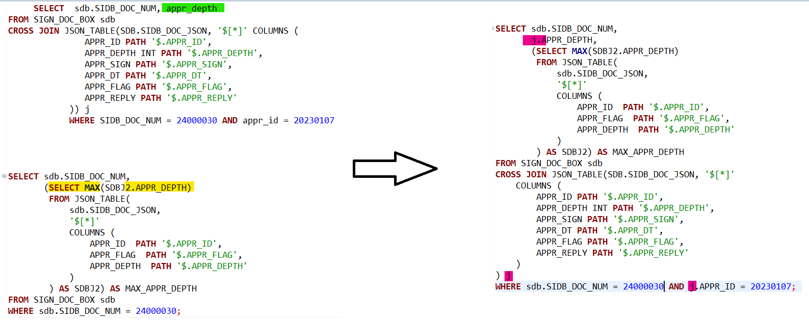 쿼리는 맞게 작성했으나 J.APPR_DEPTH라고 명확하게 밝혀주지 않아서 식별하지 못했었음 (appr_depth를 2번부를거니까 각각 명확히 밝혀줘야함)