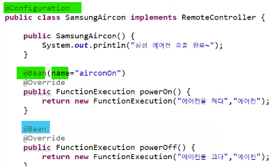 @Configuration public class Test{ @Bean public void print(){ } } XXX xxx = ~~~.getBean(Test.class) ->얘는 클래스명적어줘야함 xxx.메소드명(); |