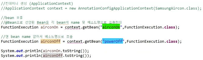 클래스명을 bean의 이름으로 camel방식으로 해서 첫글자를 소문자로쓴다음 main에서 바로 메서드 사요