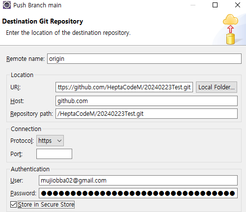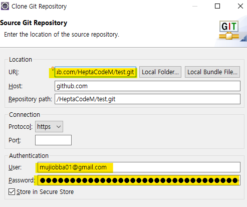 3. 초대받은 깃허브 주소의 URI 를 붙여넣기하고 User에 본인 git 아이디 (프로젝트에 참여할 git ID 맞는지 확인)