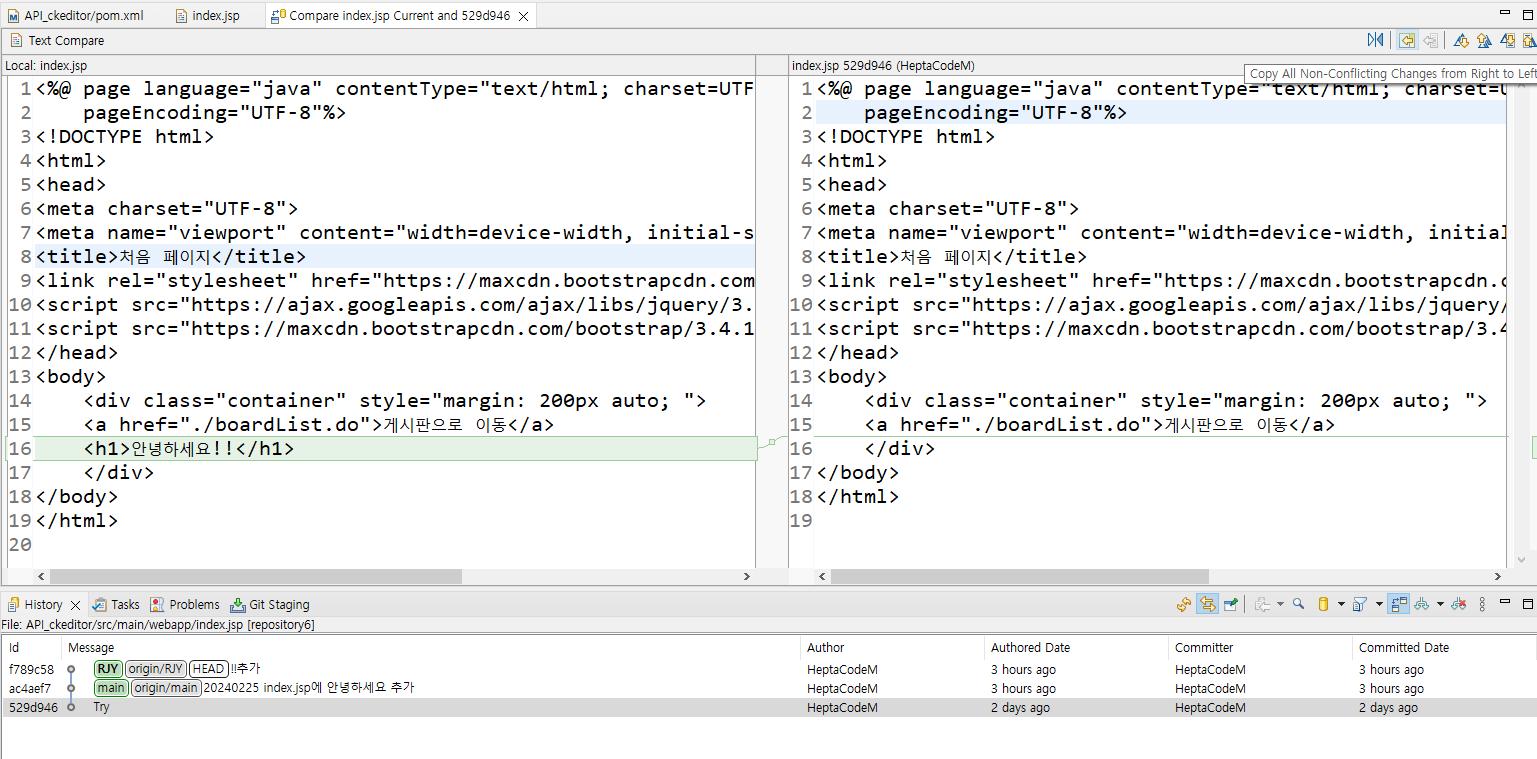 commit, push 과정 중 오류가 발생한다면 History를 눌러서 본인이 참고하고싶은 버전을 클릭하고 현재 자신의 코드와 비교해서 수정할 수 있습니다.