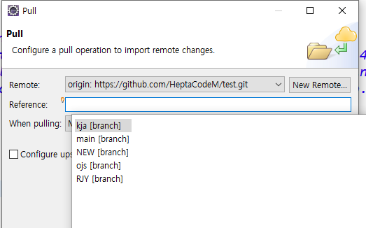 pull 하실때는 ctrl + space 누르시면 어떤 branch로부터 Pull을 할지 선택할 수 있습니다.