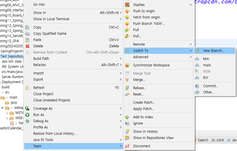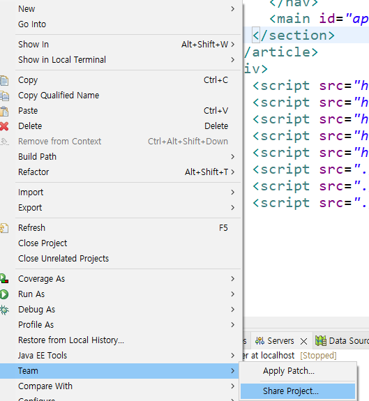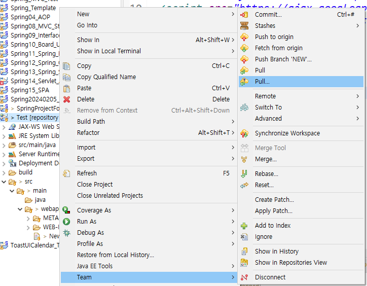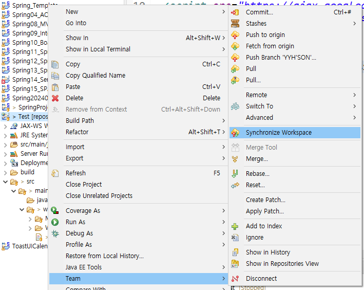 2. 프로젝트 우클릭 -> Team -> Synchronize Workspace