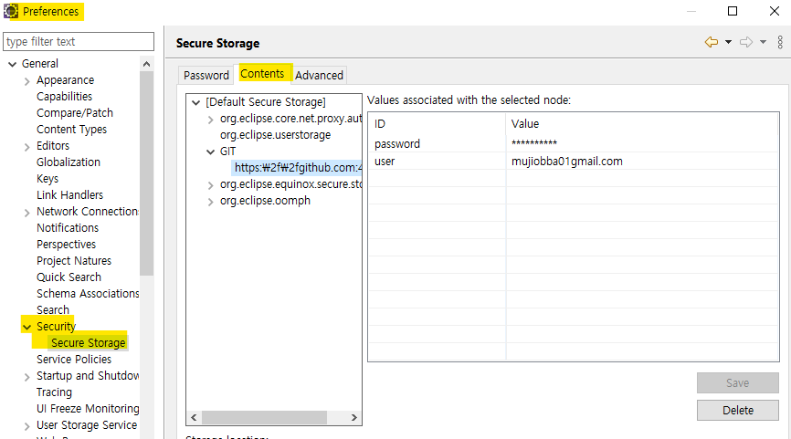 이클립스에 연동된 Git 계정 정보 삭제하기