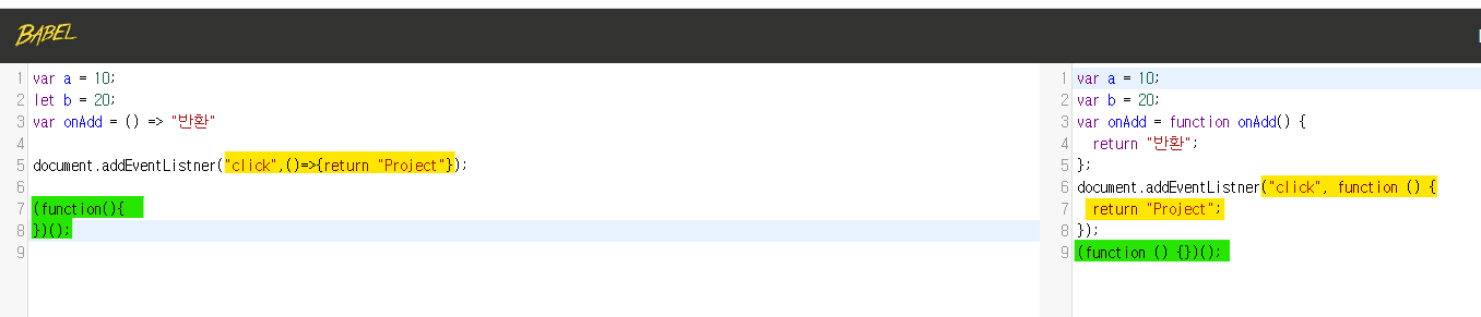 3. ES6 문법을 왼쪽에 작성하면 오른쪽에 ES5 문법으로 변경해줌